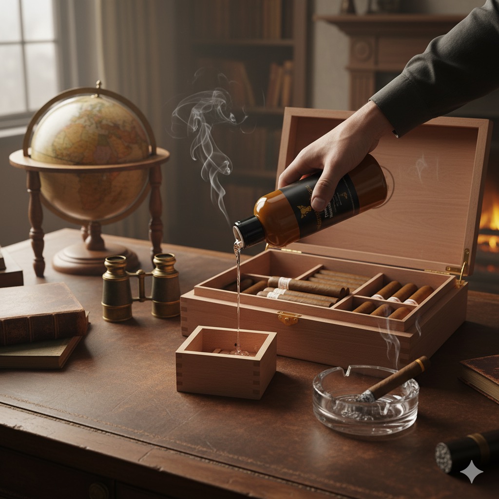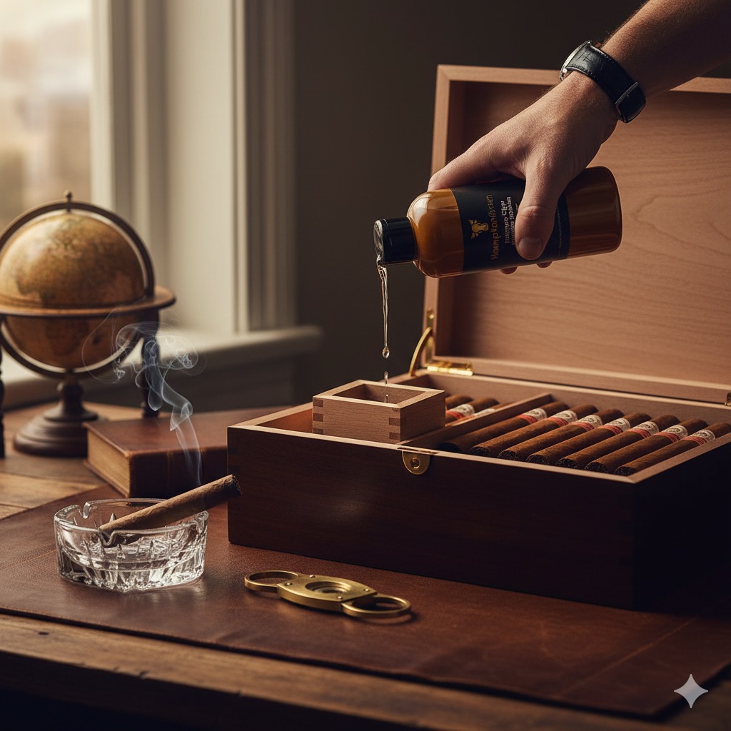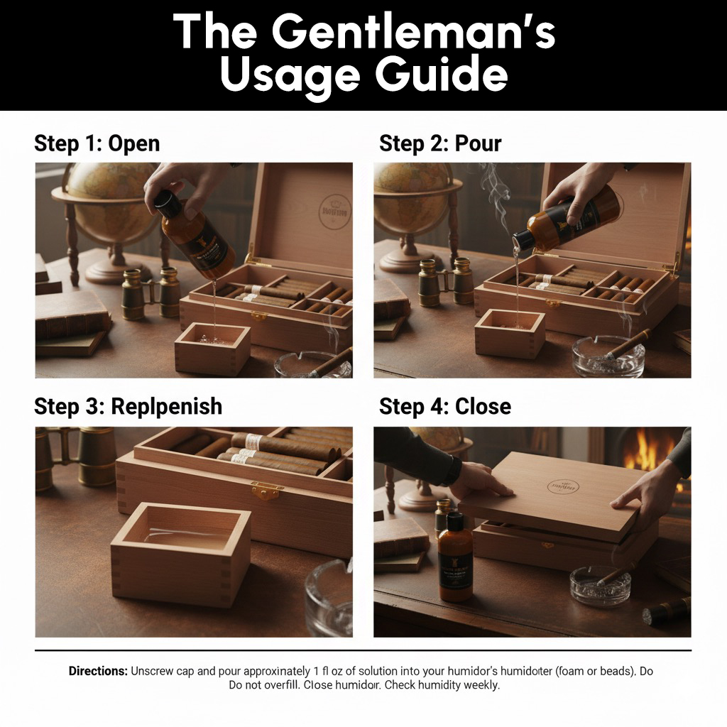 Every bottle contains an ultra pure, laboratory balanced PG and distilled water blend designed to regulate humidity automatically. It absorbs excess moisture when RH rises and releases it when levels drop. The result is a consistent environment that protects wrapper oils, prevents cracking, stops mould and maintains that perfect soft springiness every cigar lover knows by touch alone.